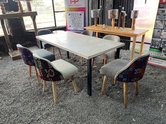 Dining set made of pine wood and kitenge fabric chairs