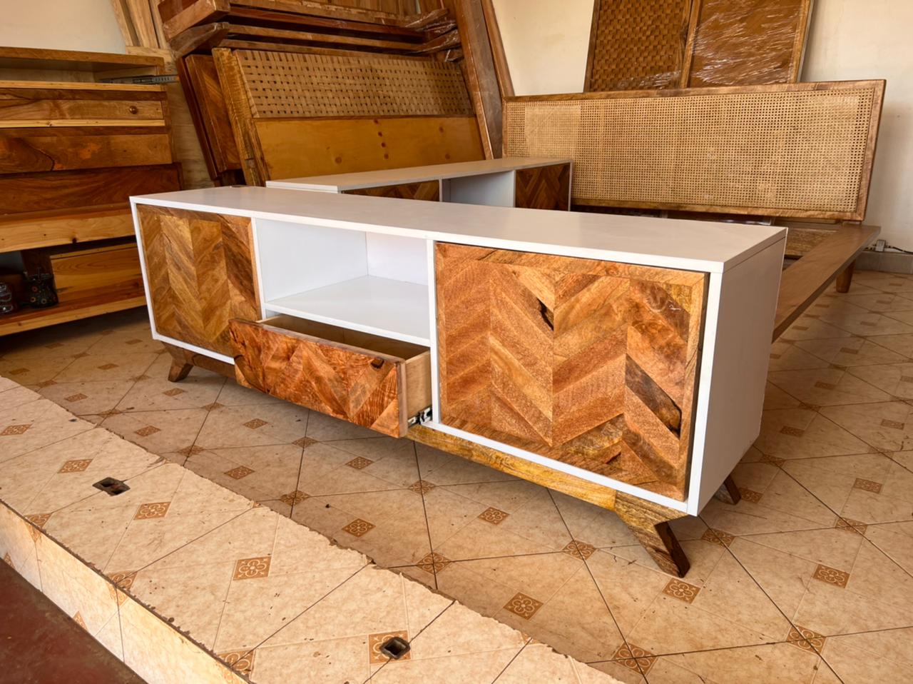 chevron tv stand made of white mdf board and mango wood